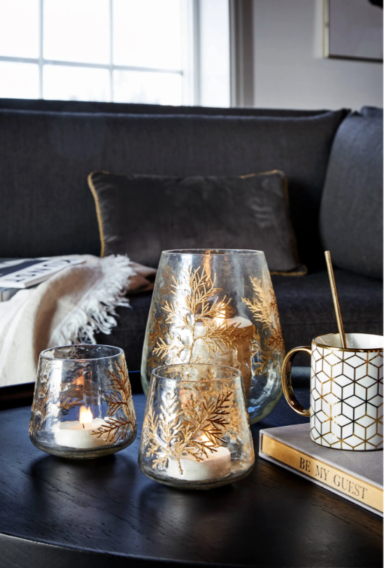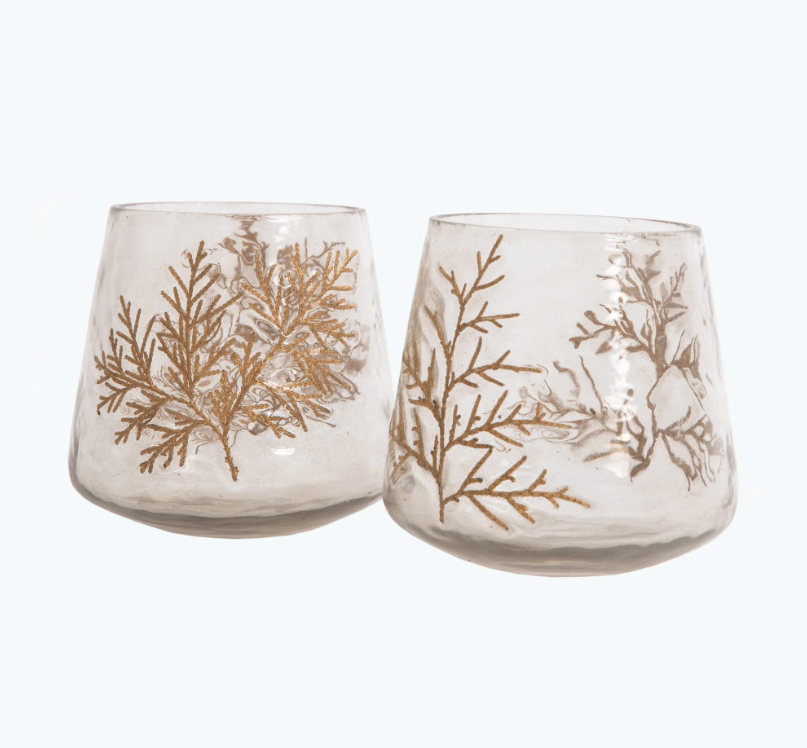 Vackra värmeljushållare med en unik dekor. De har läckra guldfärgade cypressgrenar fästa utanpå glaset. Värmeljushållarna har lackerats med genomskinligt lack och har en rustik yta. Cypress värmeljushållare passar i alla hem och är väldigt fina tillsammans med lyktan i samma serie.