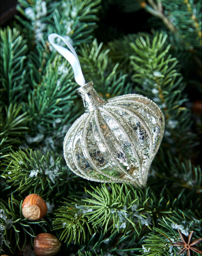 Vacker lökformad julkula i glas med antik silvereffekt och glitter.