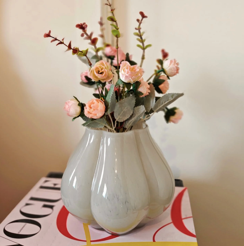 Underbar vitlöksformad vas, tillverkad av munblåst glas, vilket gör varje produkt unik. Vasen fungerar lika bra som dekoration på egen hand som med blommor. Handtvätt i mild tvål rekommenderas.
