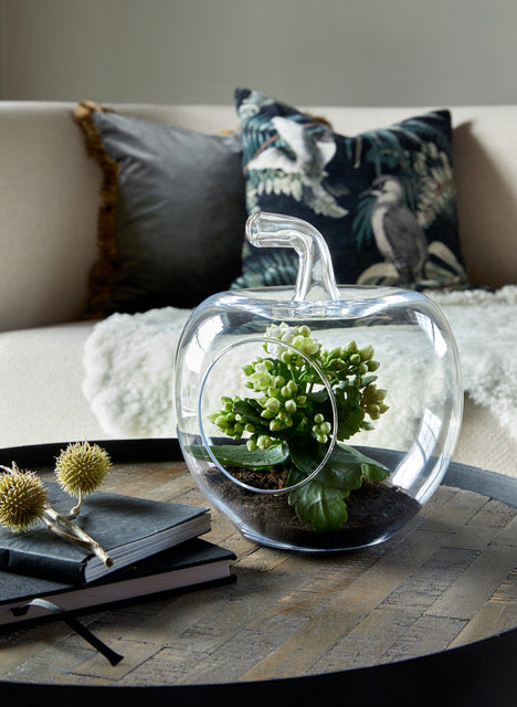 Dekorativt glasäpple som kan dekoreras med små plantor som suckulenter och kaktusar, eller med en blomsterdekoration. Apple glasobjekt är också ljuvligt fin med dekorsand och ett värmeljus. Ställ det gärna tillsammans med övriga produkter på ett dekorationsfat.