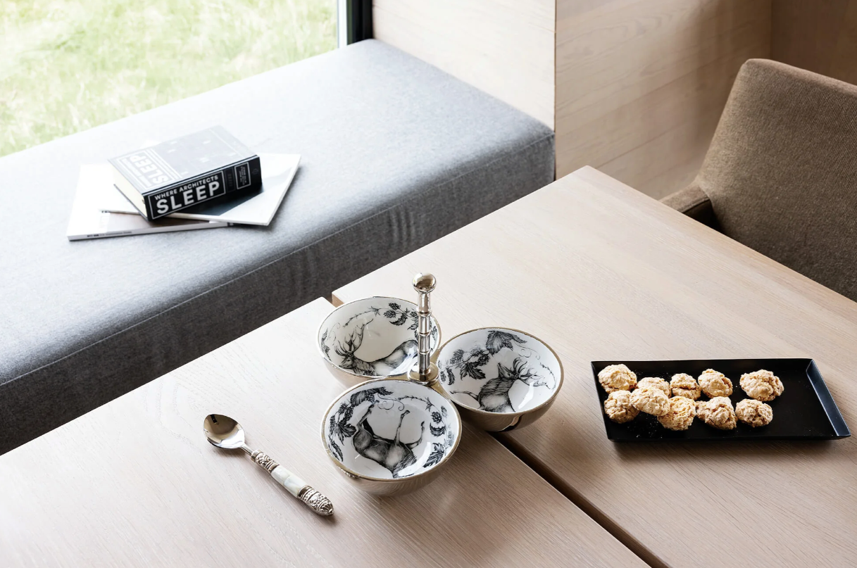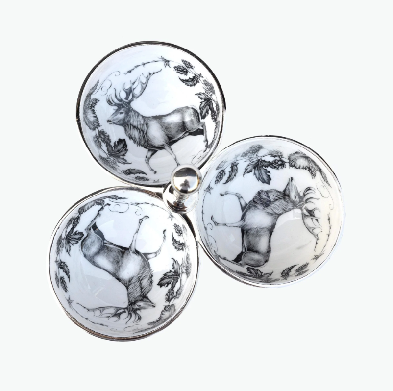 En dekorativ och praktisk tredelad skål i aluminium med nickelfinish, ytan är emaljerad i vitt med en tryckt bild av en hjort. Skålen är livsmedelssäker. Designen finns även som ett serveringsbrett. H18 Ø25 cm. Rengörs med en fuktig trasa. OBS: Det rekommenderas att inte använda mikrofibertrasa då detta kan orsaka repor på ytan.