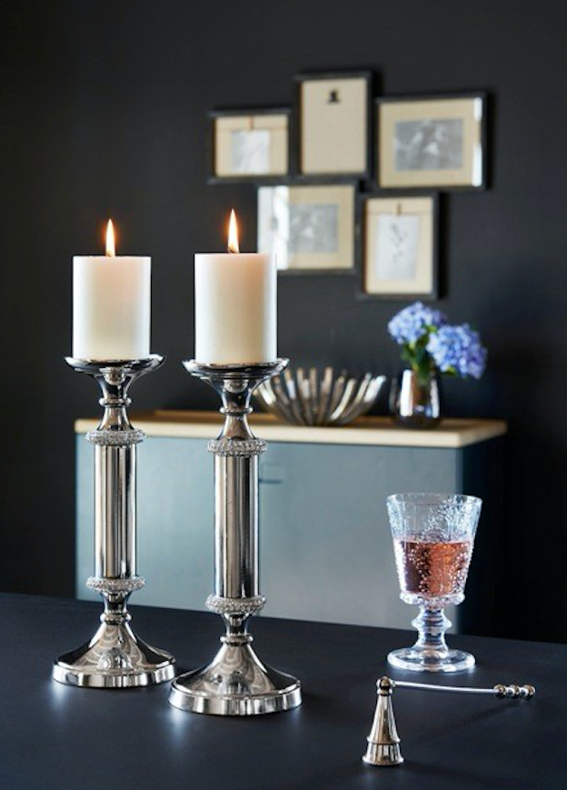 Läckra ljusstakar i blankpolerad och silverfärgad metall. Ljusstakarna är dekorerade med blanka glasstenar. Passar till både kronljus och blockljus. De är vackra alldeles själva på en skänk, byrå eller på ett sidobord och även superfina på ett festdukat middagsbord.
