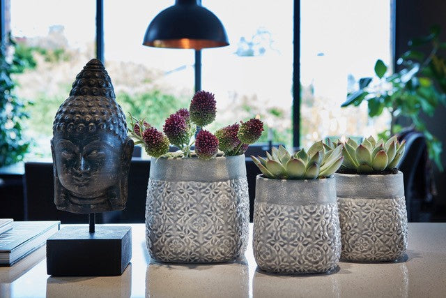 Delikata keramik-krukor med ett vackert mönster i gråa nyanser och en melerad grå kant högst upp. De är bara helt fantastiskt vackra med olika gröna plantor i. Passar i de allra flesta hem. Du får de två små krukorna med i din startkollektion.