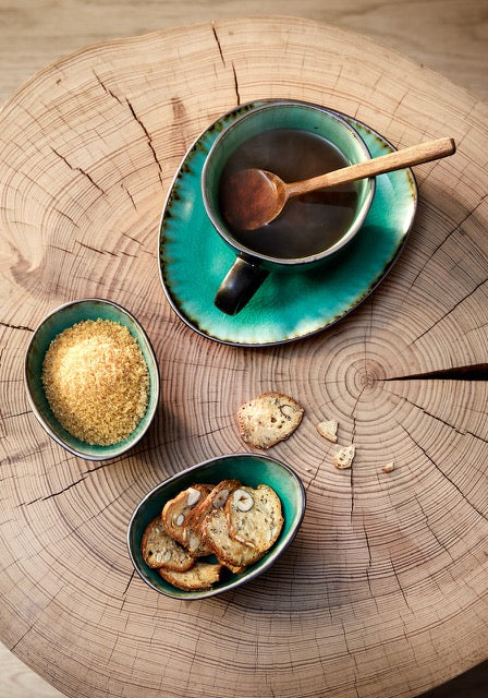 Duka ett färgglatt och glädjespridande bord med Green Jungle stengodsservis. Denna läckra servis är handgjord och har vackra organiska former som har inspirerats av naturen. Servisens yta har en helt speciell reaktiv glasyr med en spännande krackeleringseffekt. Kombinationen av de vackra organiska formerna och den reaktiva glasyren gör att ingen av servisens delar är lika. Detta ger Green Jungle en karaktäristisk prägel och gör servisen helt unik.