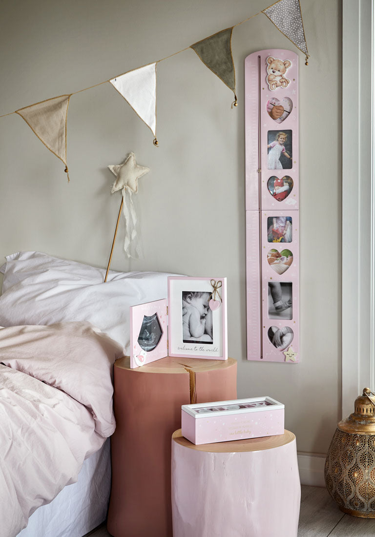 Growing Up är en helt ljuvlig barnserie som bokstavligt talat växer med barnet. Serien består av en dubbelram där det finns plats för ultraljudbild och en vanlig 10x15cm-bild, ett gulligt skrin för förvaring av barnets första tand, första hårlock och namnband från sjukhuset. Här kan man självklart samla flera tänder och hårlockar. Till sist en mätsticka som mäter barnets längd från 70-160 cm. Mätstickan har även plats till 7 bilder som man kan sätta in av barnet under tiden som det växer. De tre produkterna kommer i både rosa och blått.