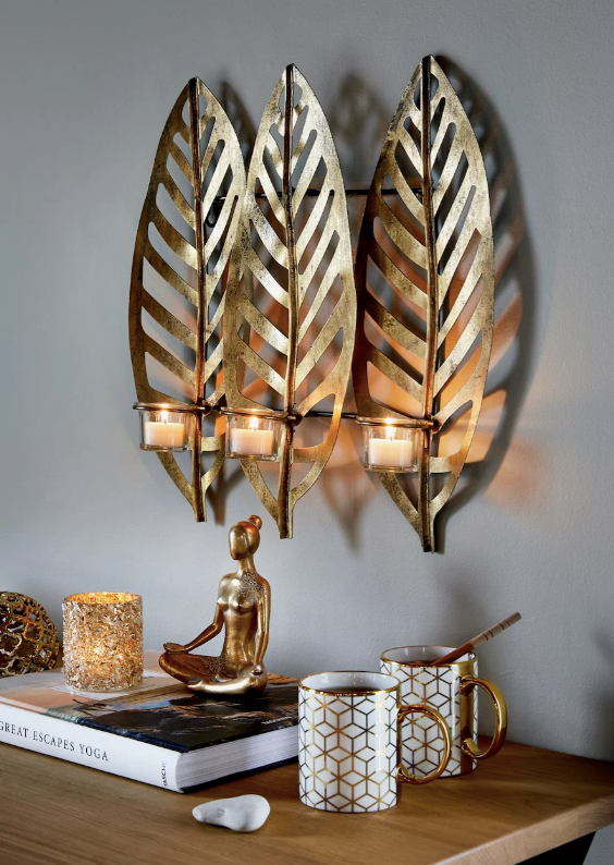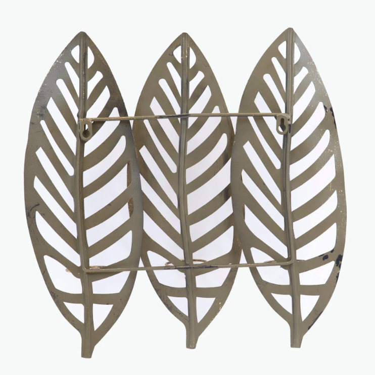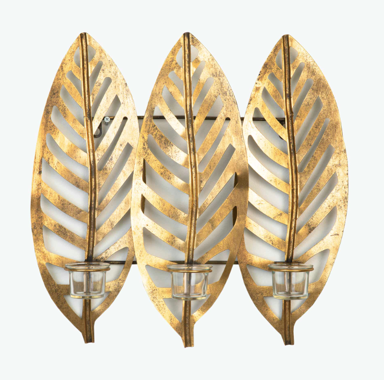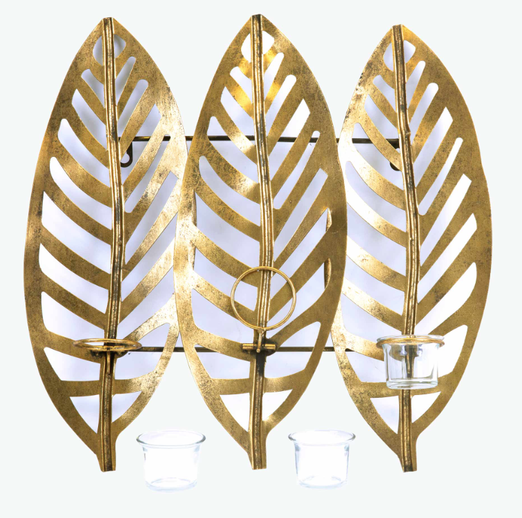 Dekorativ väggljusstake med en vacker bladdesign som verkligen klär att hänga på väggen. Havana är handgjord i järn och har en antik guldfinish. Värmeljushållarna är av glas.