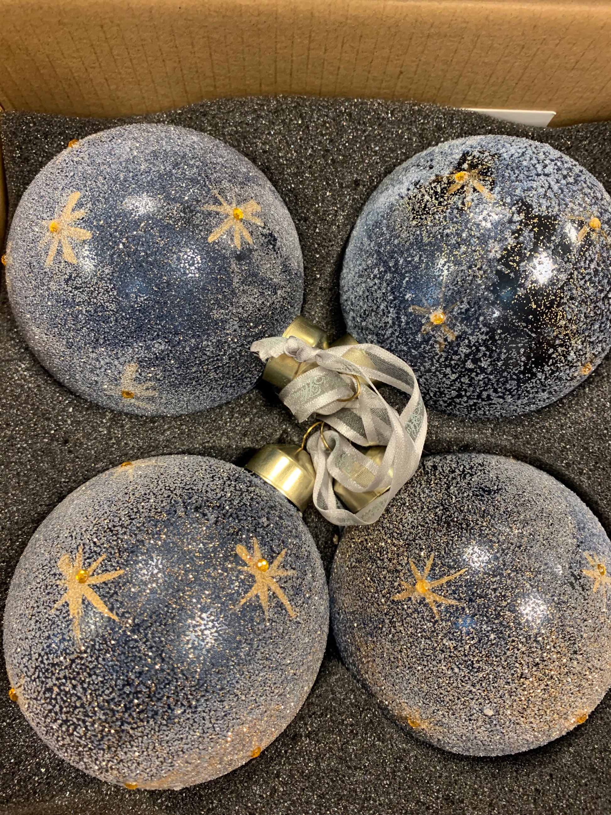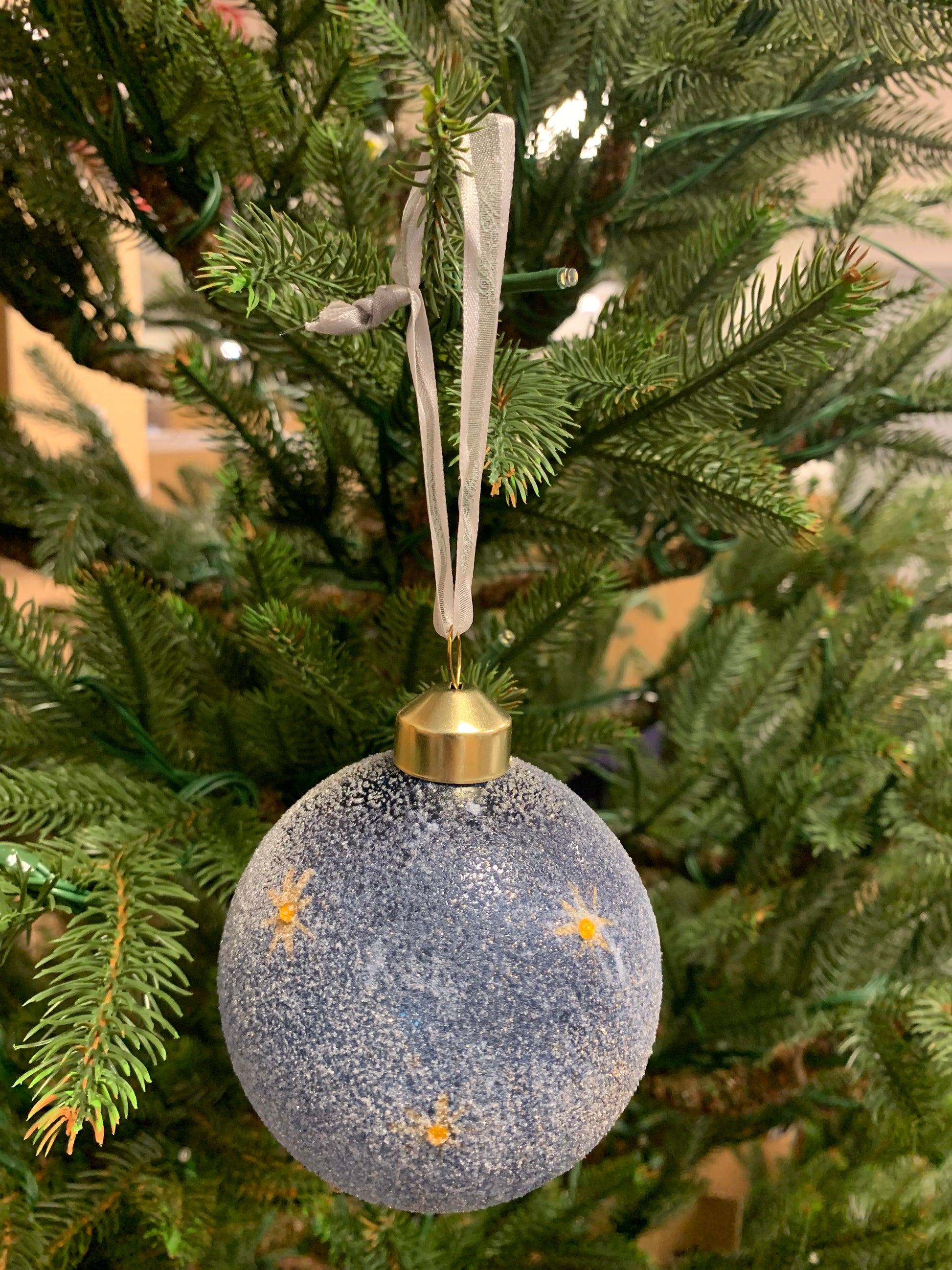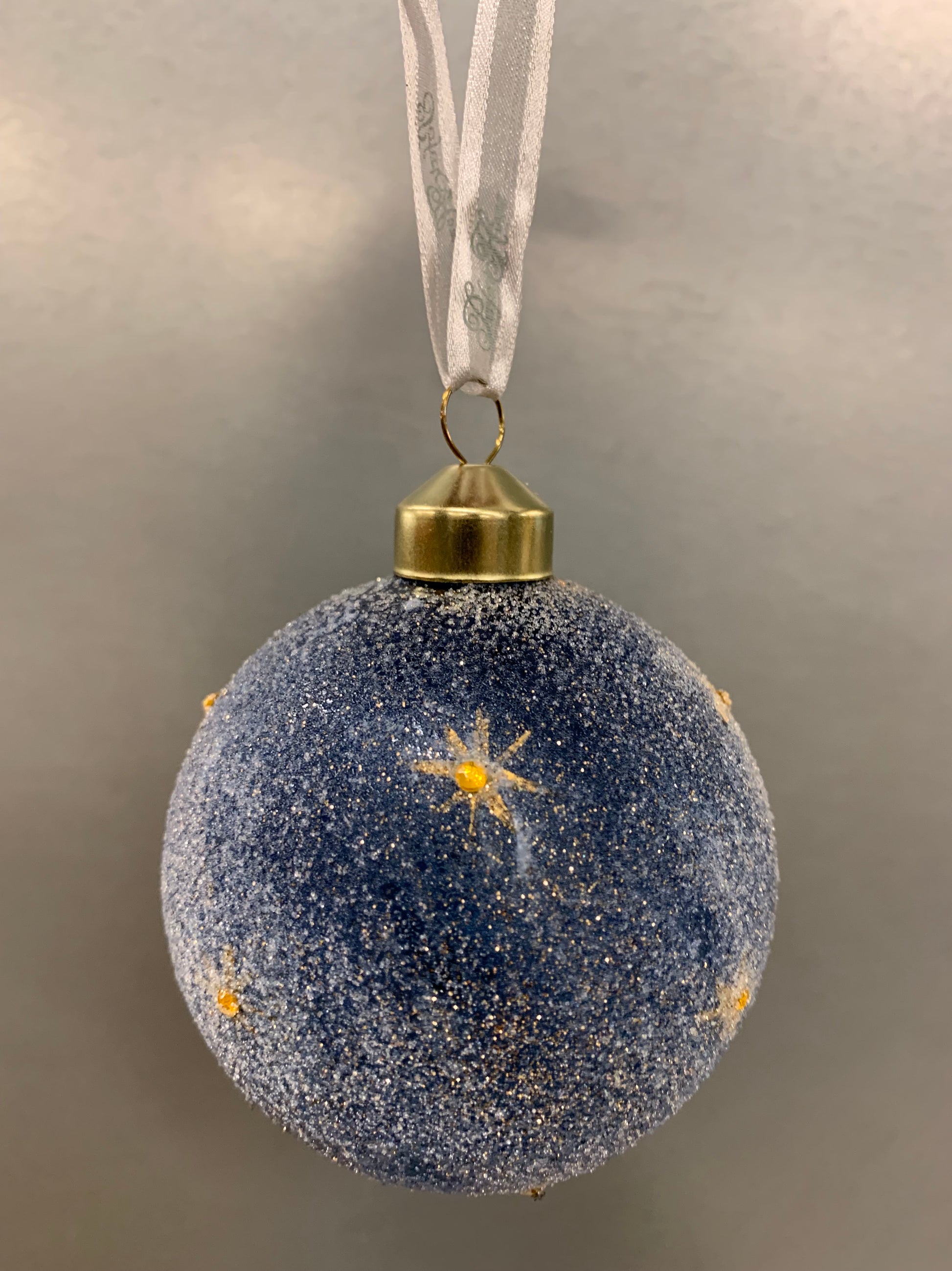 Vacker julkula i en fantastisk fin blåfärg. Kulan är dekorerad för hand med glitter och pärlor.