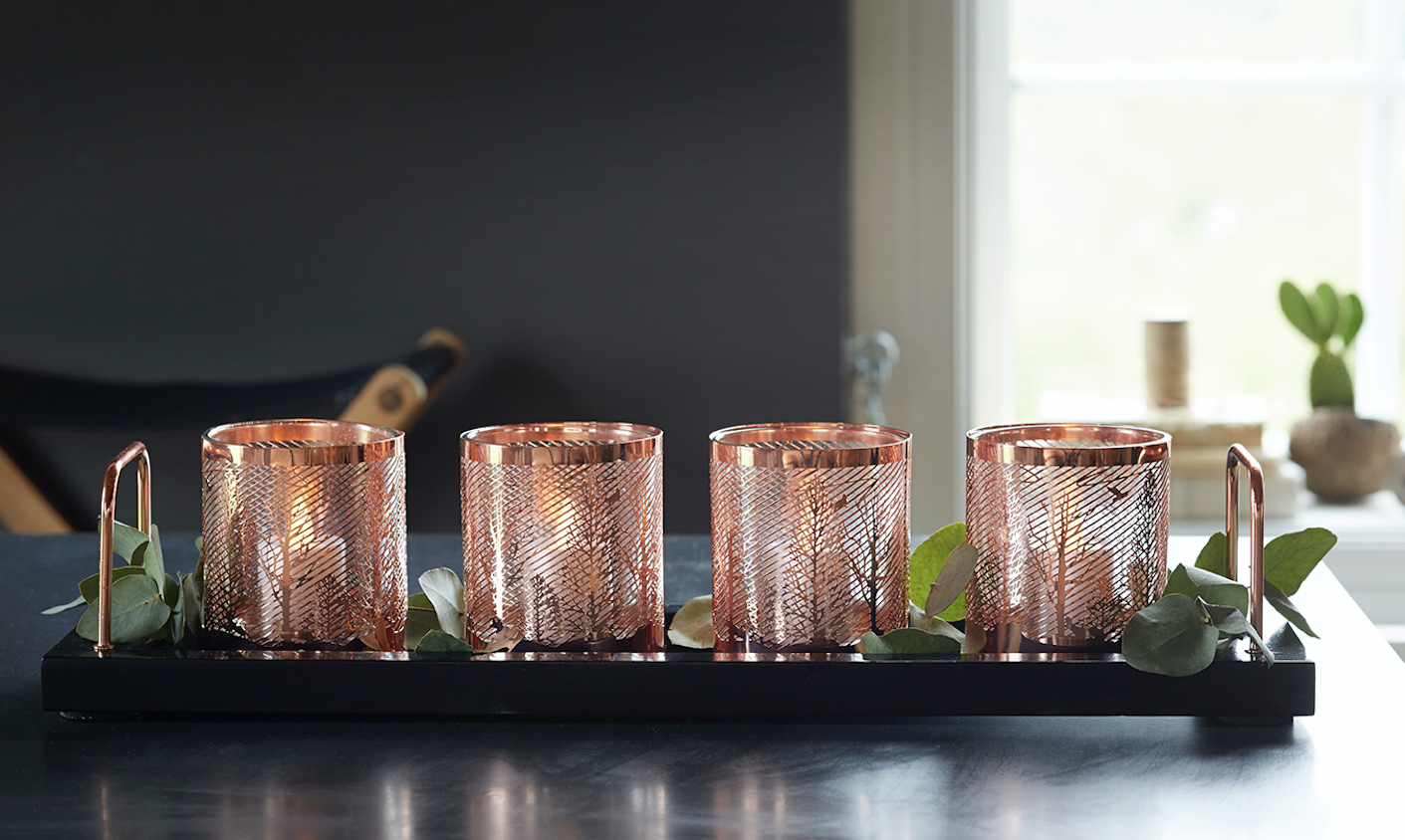 Läcker lyckta av laserskuren koppar och glas. OBS! Endast lyktorna som säljs och inte den svart brickan.