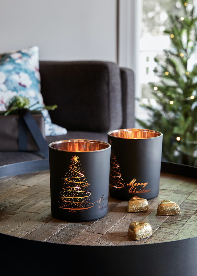 Stiliga värmeljushållare med kopparfärgad insida och ett svart julmönster utanpå. Du får ett vackert och mysigt sken när du tänder värmeljus i dessa. Merry Christmas värmeljushållare är jättefina för sig själva eller tillsammans med andra produkter på ett dekorationsfat.