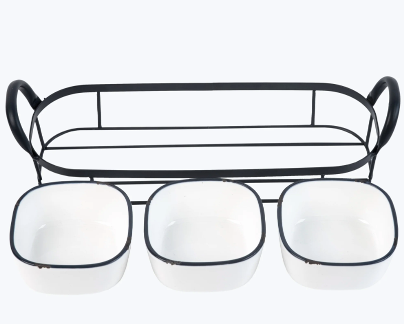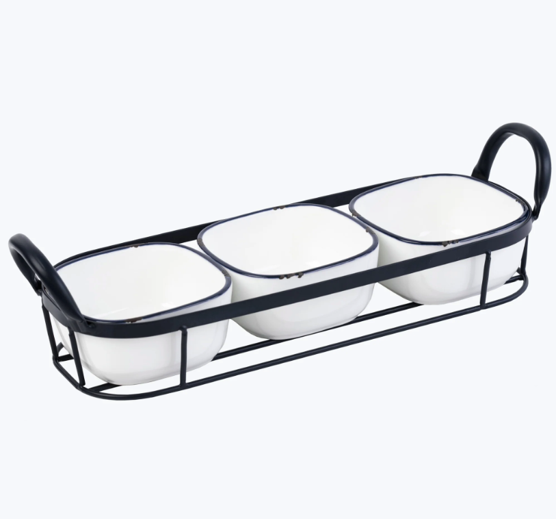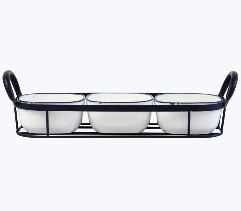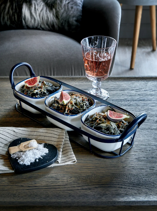 Servera de ljuvligaste maträtter i Othilia eldfasta former. Perfekt till tacos, tapas och gratinerade rätter. De eldfasta porslinsformerna kan ställas i stativet direkt på bordet - superpraktiskt! Den mörkblå kanten på formen är handmålad och ger Othilia en nostalgisk och hemtrevlig stil. Stativ i pulverlackerat järn medföljer.