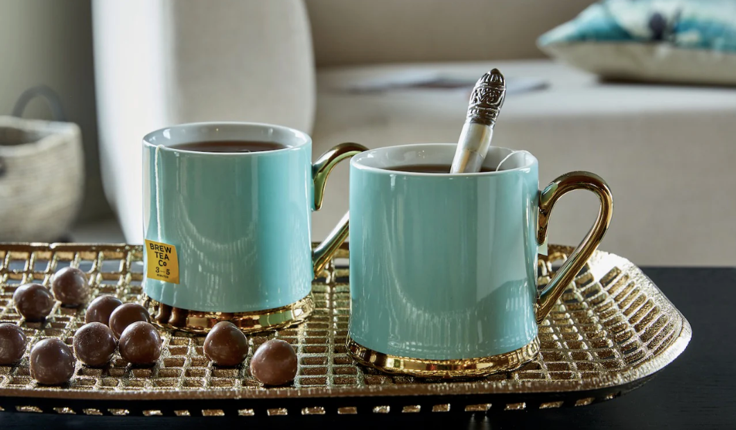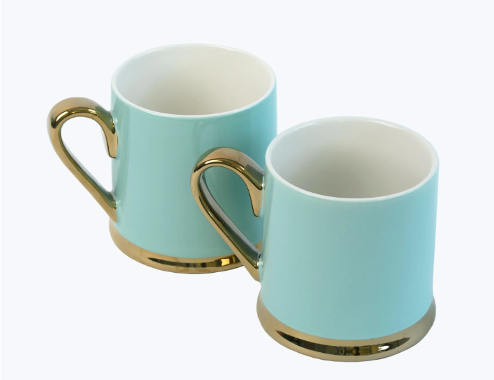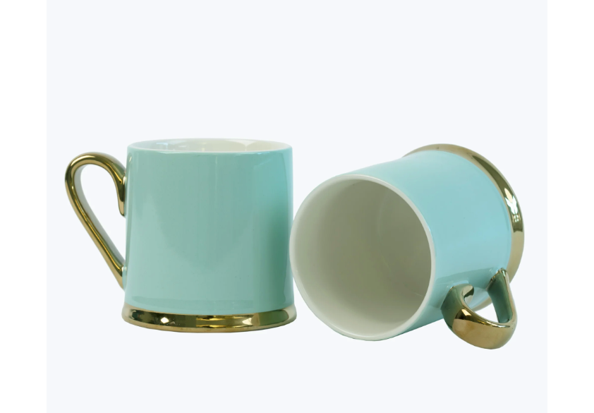 Läcker mintgrön porslinsmugg med underbart fina gulddetaljer. Detta är en mugg det är kul att dricka ur - och med stor sannolikhet blir det din favoritmugg. Tål diskmaskin – glansmedel rekommenderas. Guldfärgen kommer kunna nötas bort över tid vid disk i diskmaskin.