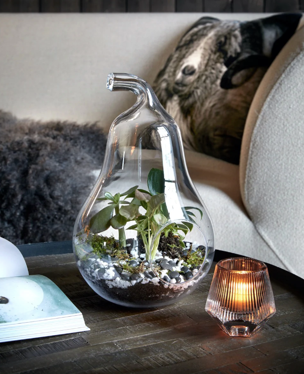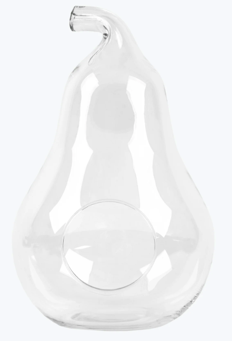 Dekorativt glaspäron som kan dekoreras med små plantor som suckulenter och kaktusar, eller med en blomsterdekoration. Pear glasobjekt är också ljuvligt fin med dekorsand och ett värmeljus. Ställ det gärna tillsammans med övriga produkter på ett dekorationsfat.