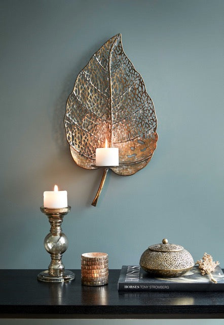 Dekorativ väggljusstake som är format som ett vackert blad. Rafaela är handgjort i metall med en antik guld finish.
