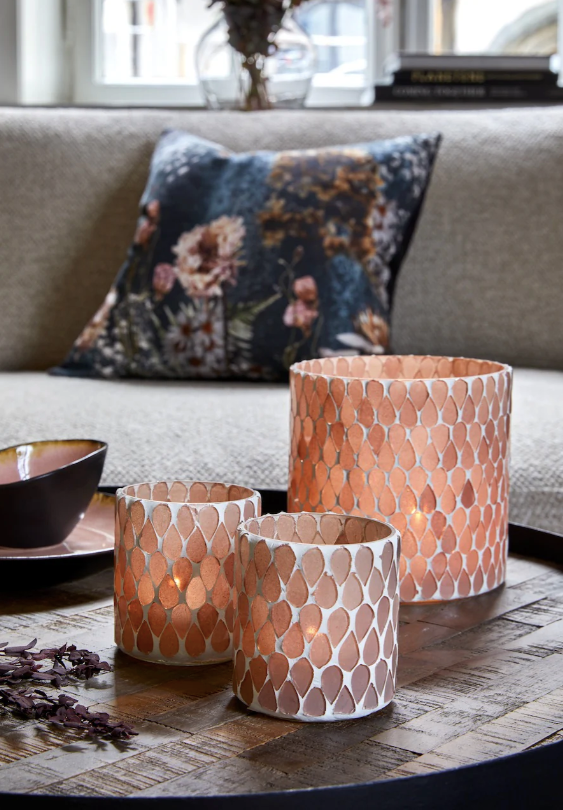 Underbart fin lykta som har dekorerats med rosa glasmosaik som ger ett vackert färgspel. Först munblåses glaset, därefter läggs den fina mosaiken på för hand. Rosalin lykta kan också gärna användas som vas.
