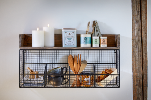 Praktisk och dekorativ hylla av trä och svartmålad metall. Dekorera hyllan precis så som du vill, antingen du har den i köket, i hallen eller i sovrummet.