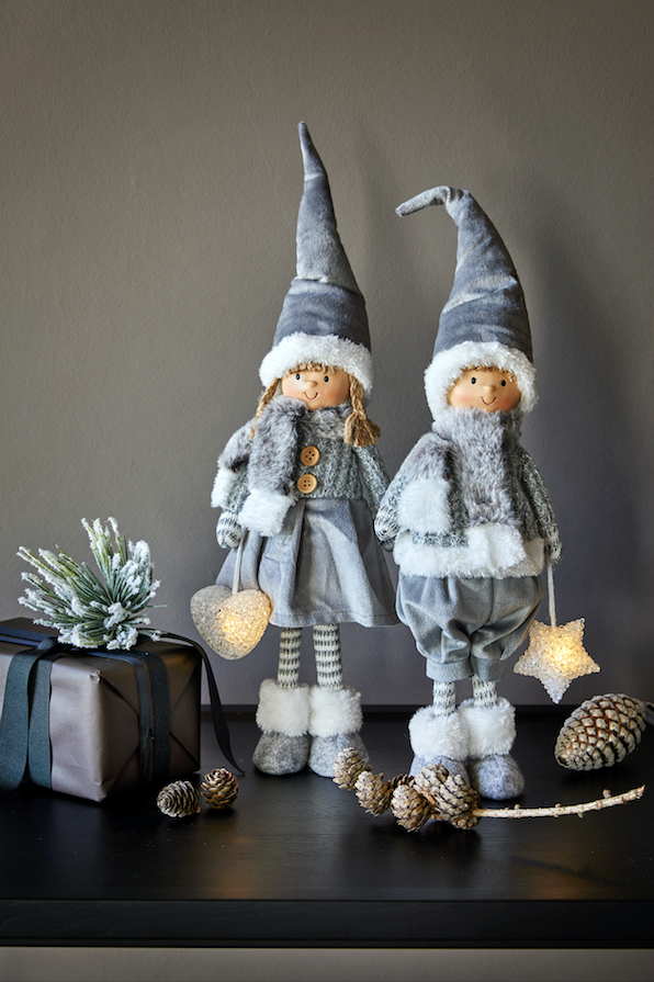Charmiga tomtebarn som bär på ett lysande hjärta och en stjärna. De gulliga ansiktena är gjorda i polyresin som får fram detaljer på ett fint sätt.