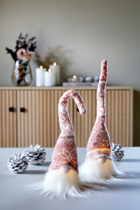 Supergulliga textiltomtar med stickade tomteluvor som kan placeras överallt där man vill ha extra lysande julstämning. Tomtarna kan även hängas upp i luvan.