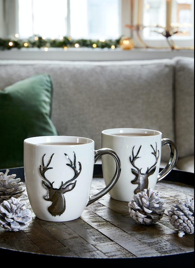 Läcker porslinsmugg med hjortmönster i silver. Detta är en stor och mysig mugg som inte bara passar till te och kaffe, utan dessutom strålande även till latte och varm choklad med grädde.