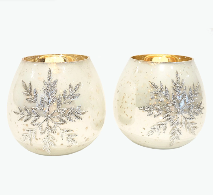 Skapa julmagi med våra handgjorda värmeljushållare i munblåst glas. Dessa eleganta ljushållare har en vacker antik guldfinish på insidan, som ger värme och sken, medan den vita antika finishen på utsidan ger den ett tidlöst utseende. Varje ljushållare är dekorerad med snöflingor i silverglitter.