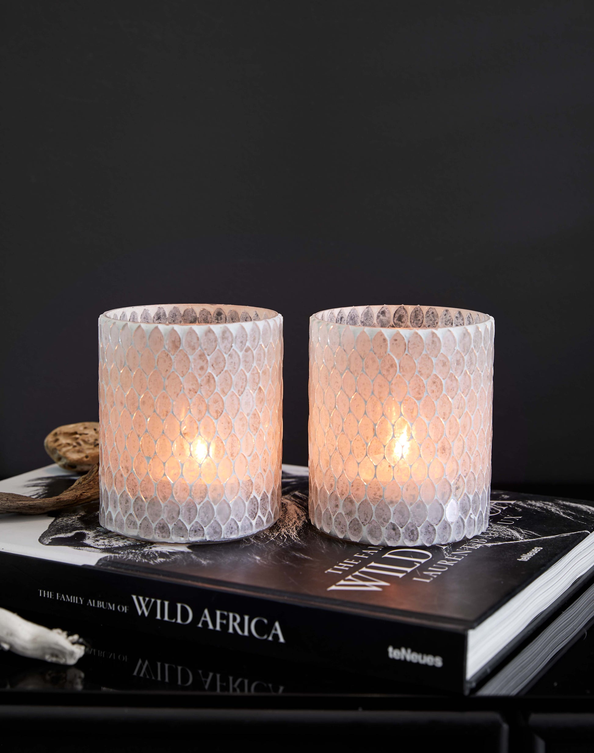 Härliga och somriga värmeljushållare gjorda av glasmosaik med en fin ljus rosa skimrande färg. Fina som de är eller på ett dukat festbord. Värmeljushållarna är också fina till små blomsterbuketter