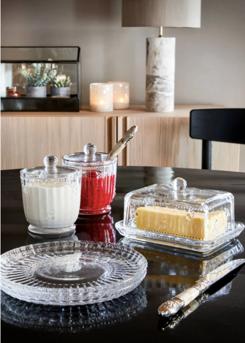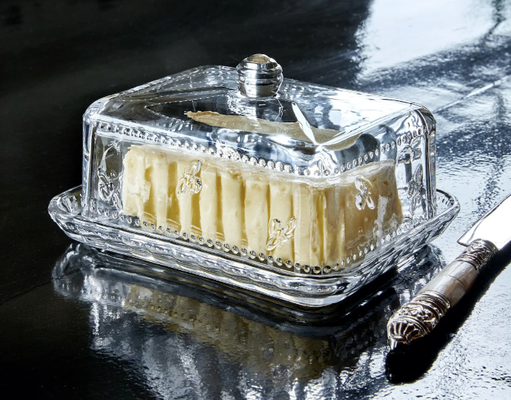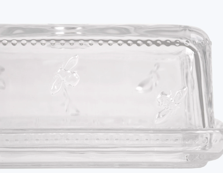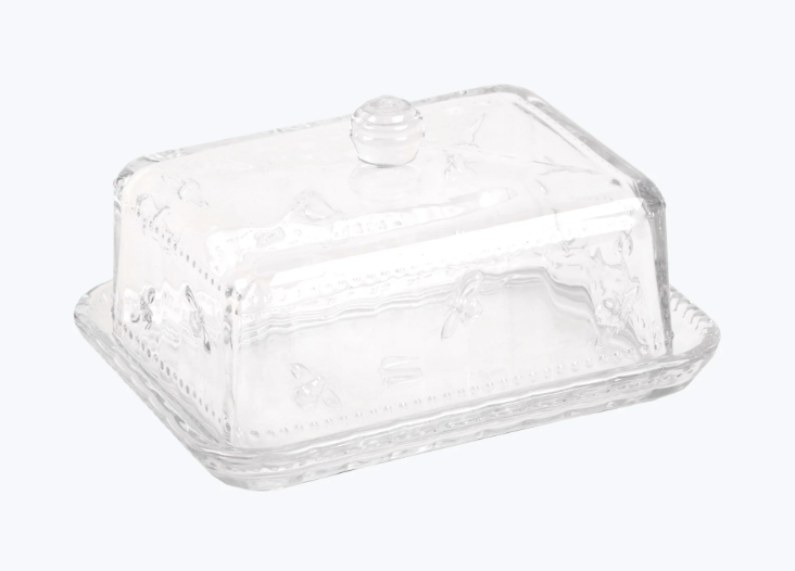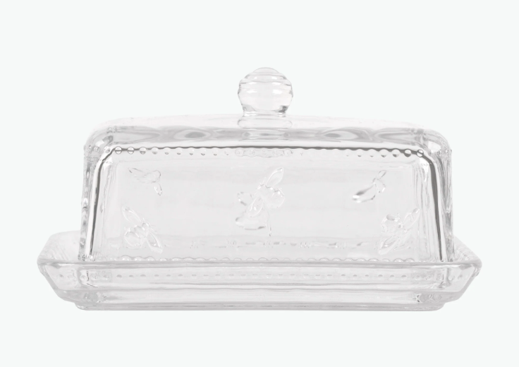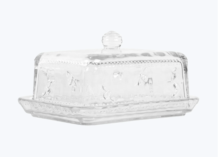 Charmerande smör- eller ostfat av pressglas med ett gulligt humlemotiv. Perfekt till frukostbordet.