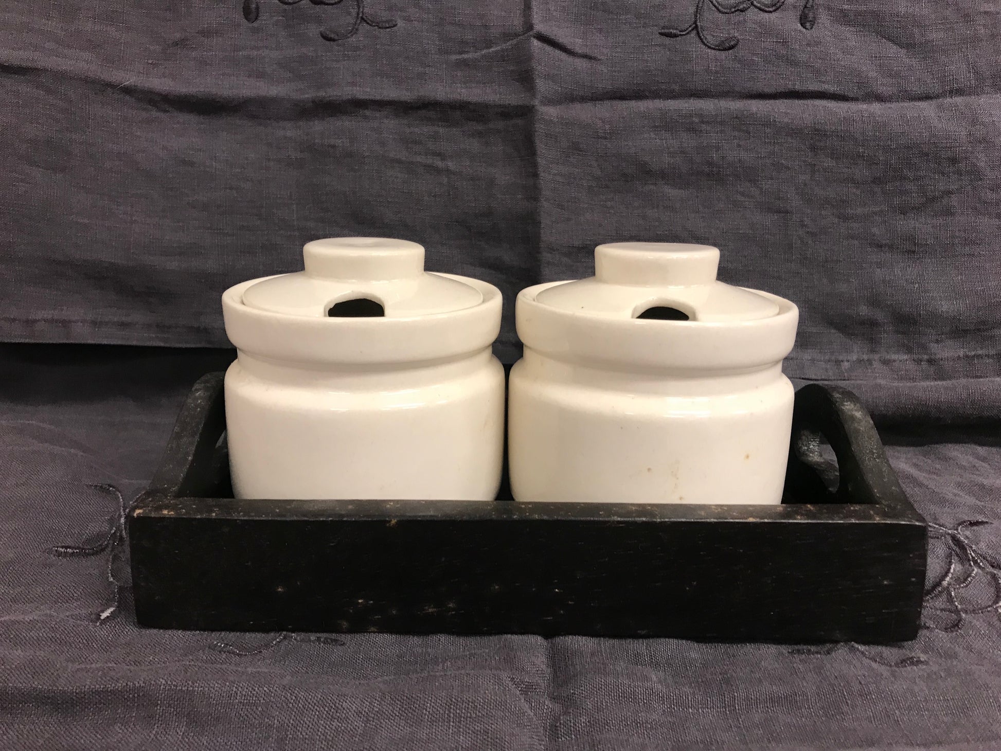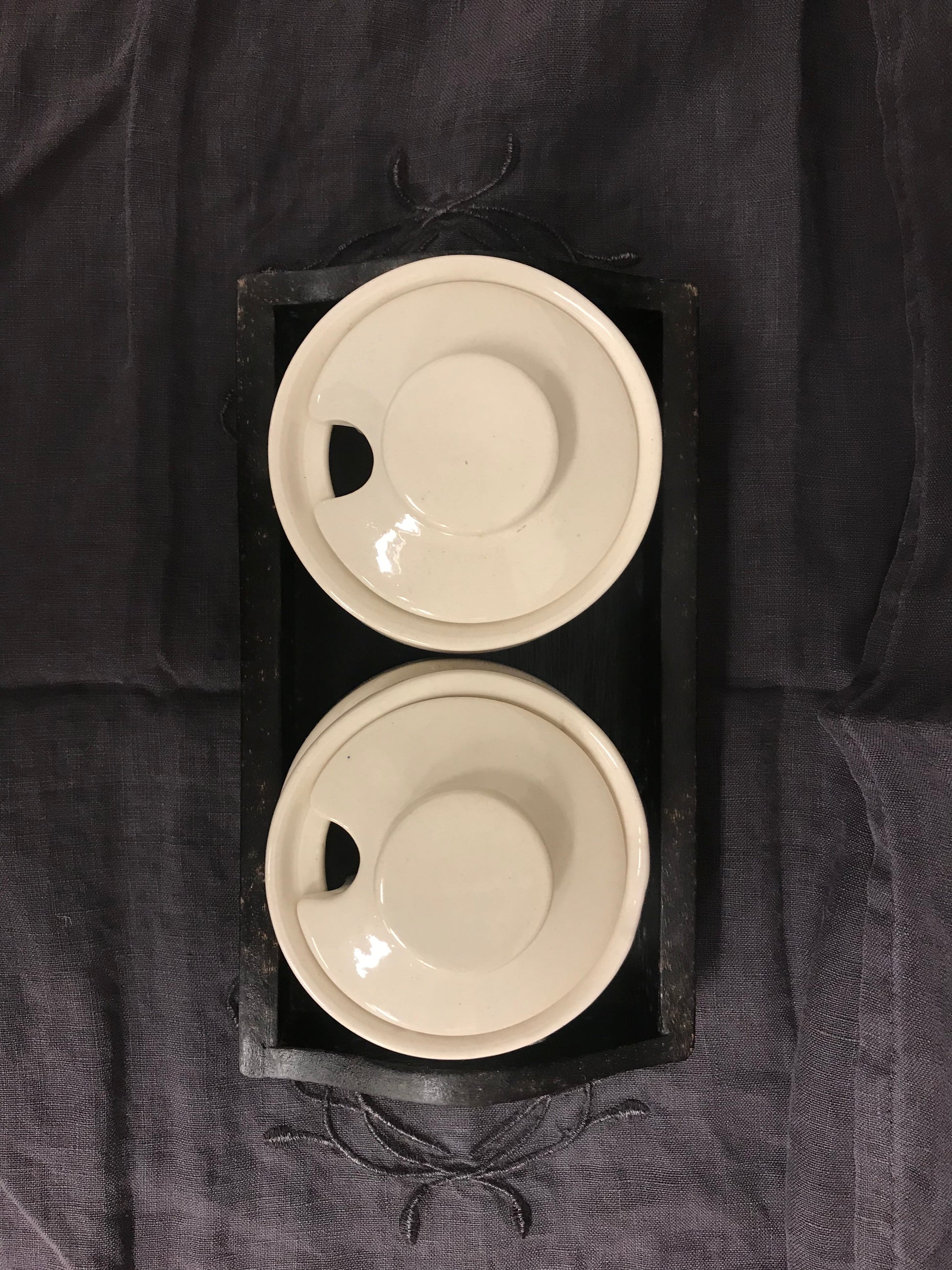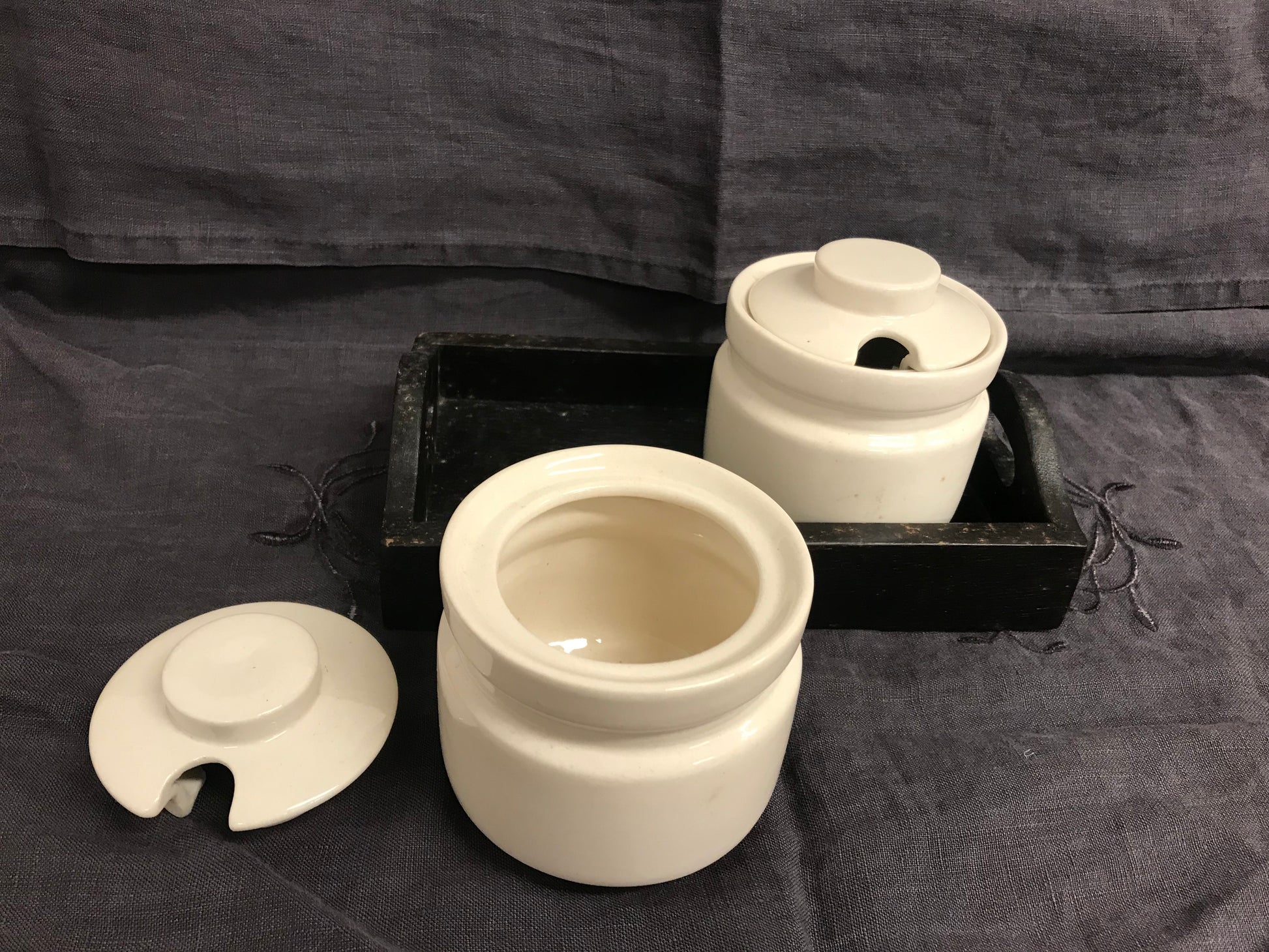 Två fina syltkrukor som står på en träbräda. En fin detalj i köket.