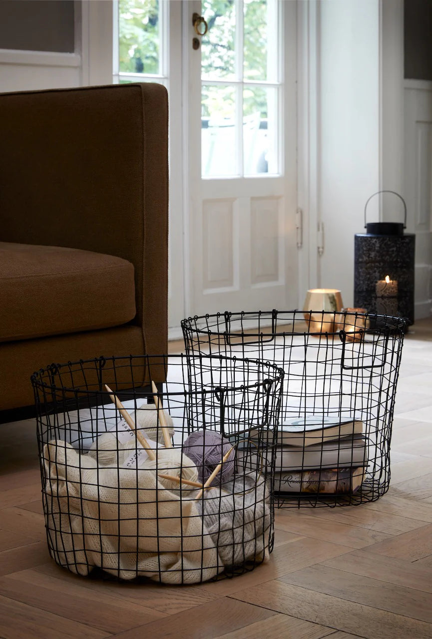 Treviso är två stiliga och praktiska förvaringskorgar i svart metall. Passar utmärkt i vardagsrummet till stickor och garn, filtar och tidningar, i hallen till vantar och mössor, eller i badrummet till smutstvätt, tvättlappar/handdukar och toarullar. Stor korg H30 Ø40 cm. Liten korg H28 Ø37 cm.